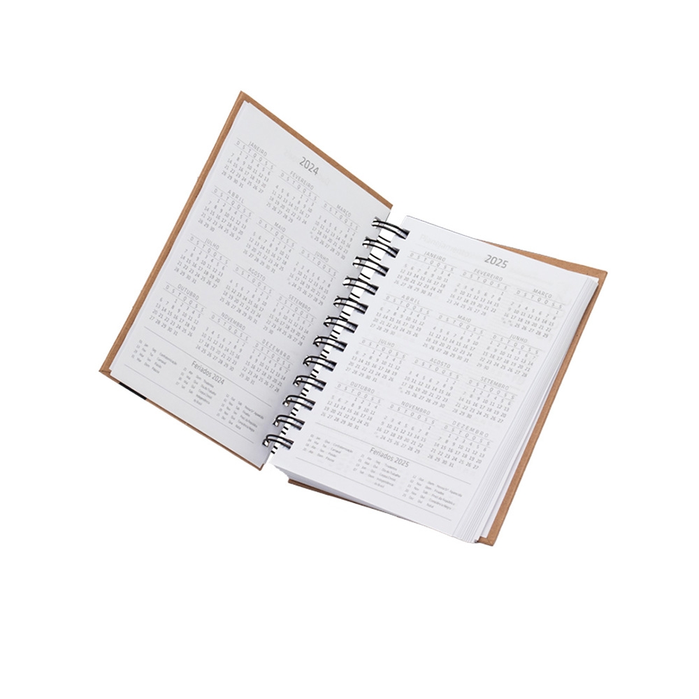 Agenda diária 2026 com espiral, material kraft, capa dura. Contém aproximadamente 169 folhas, entre elas, páginas de dados pessoais, calendário 2026, planejamento e aniversários do mês.
