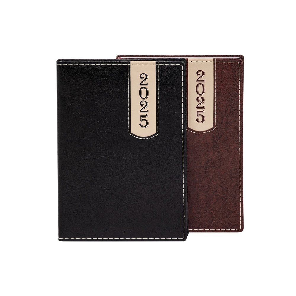 Agenda produzida em couro sintético, possui detalhes de costura e escrita do ano ?2026? na parte superior direita. Contém marca página em cetim, páginas de dados pessoais, calendário de 2026, mapa do Brasil, mapa global, índice telefônico e planejamento.