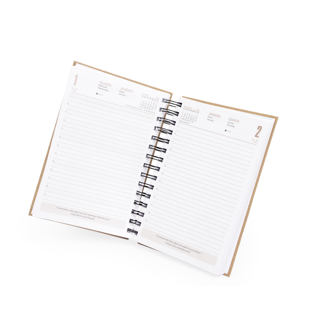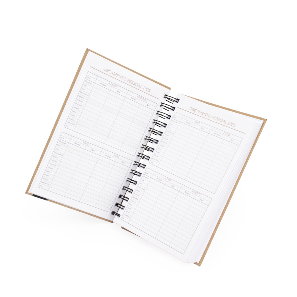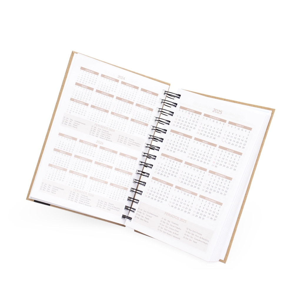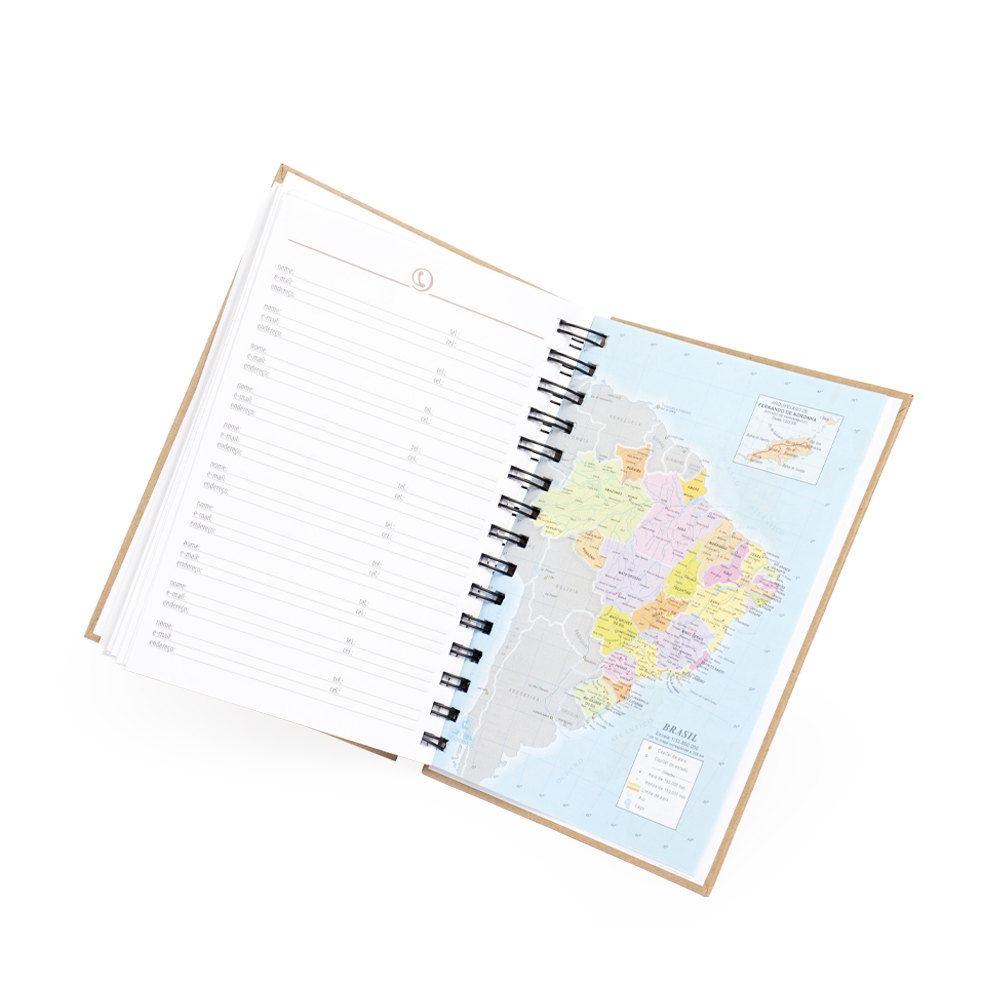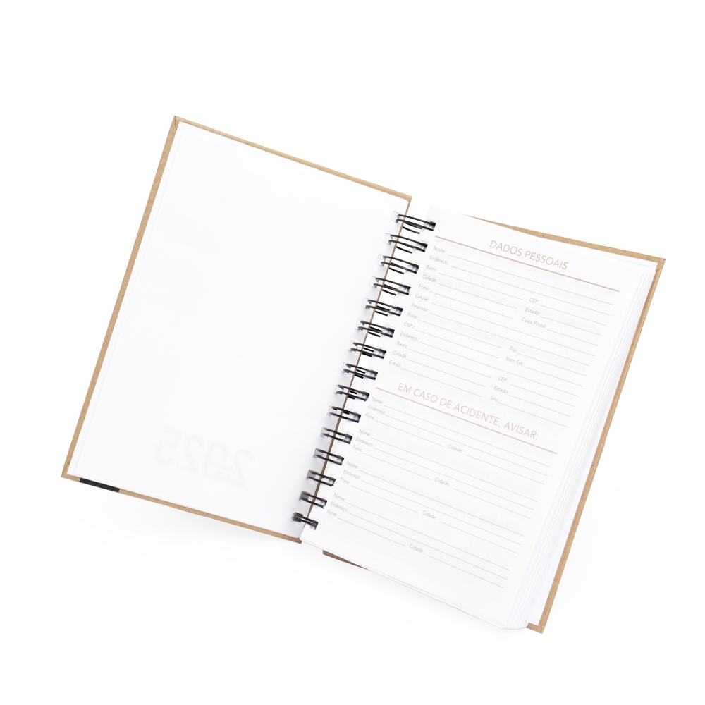 Agenda diária 2025 com espiral, material kraft, capa dura. Contém páginas de dados pessoais, calendário 2024 a 2025, orçamento pessoal, anotações, mapa do Brasil, mapa da América do Sul, mapa da América do Norte, mapa Mundi, mapa da Europa, mapa da África, mapa da Ásia, índice telefônico e planejamento.