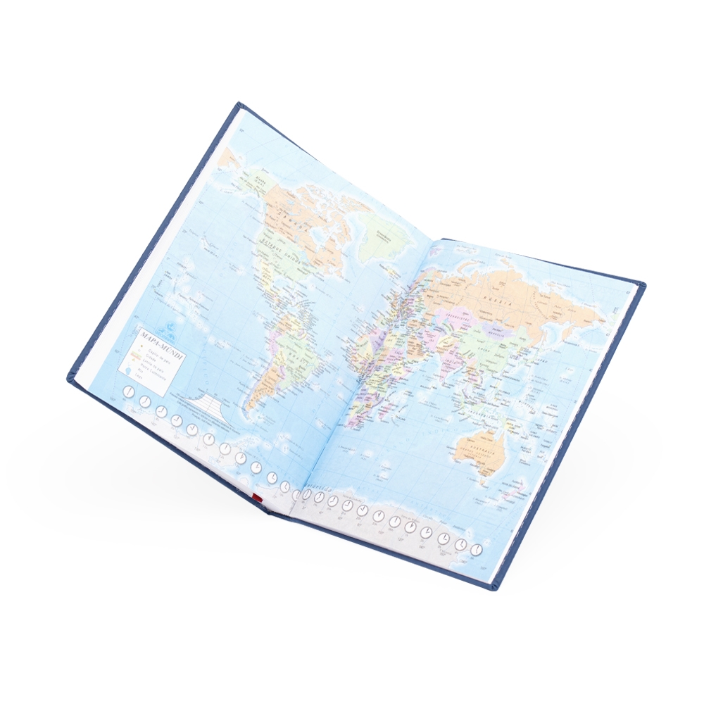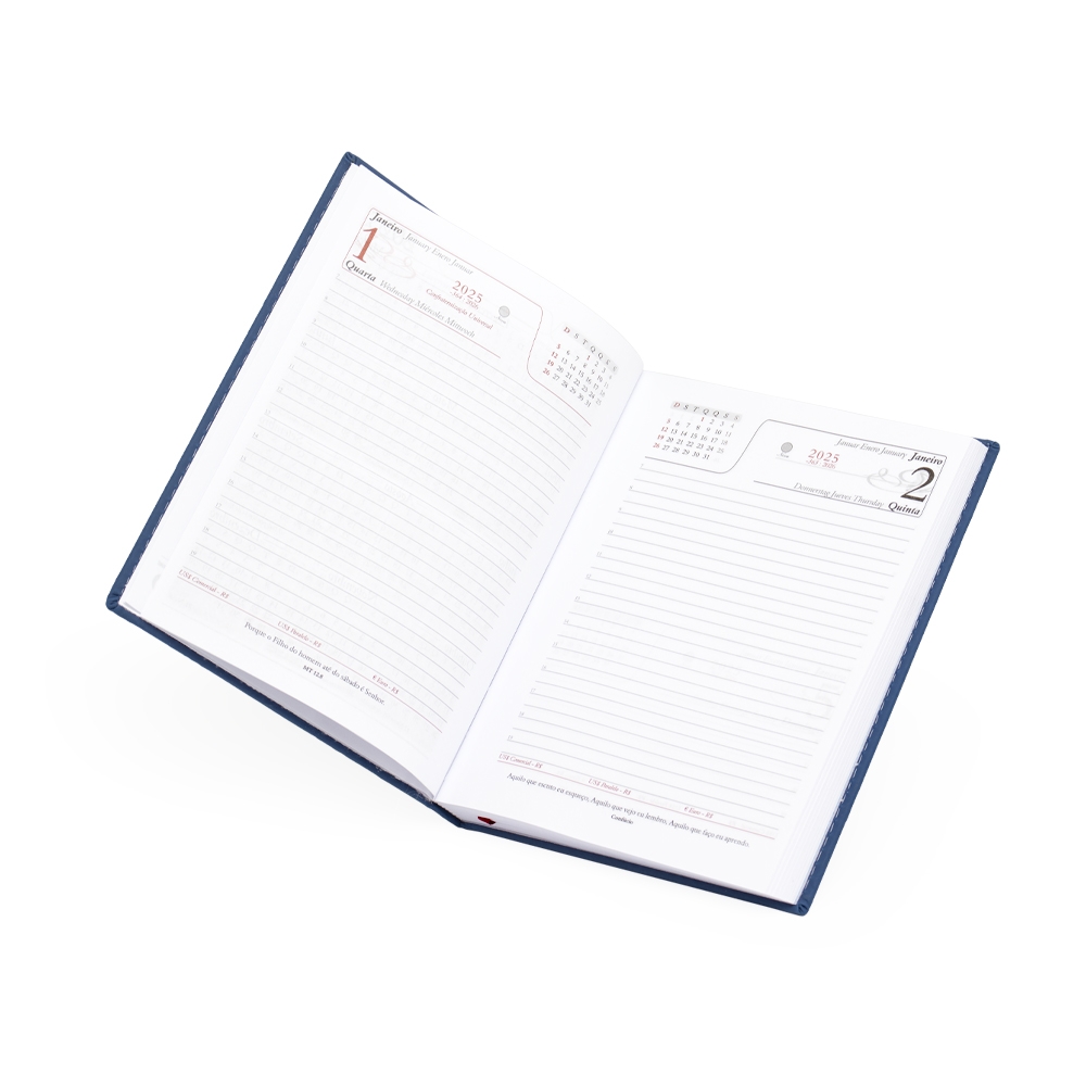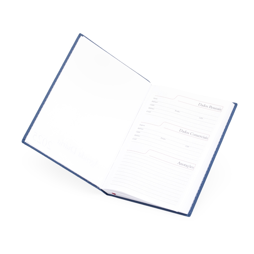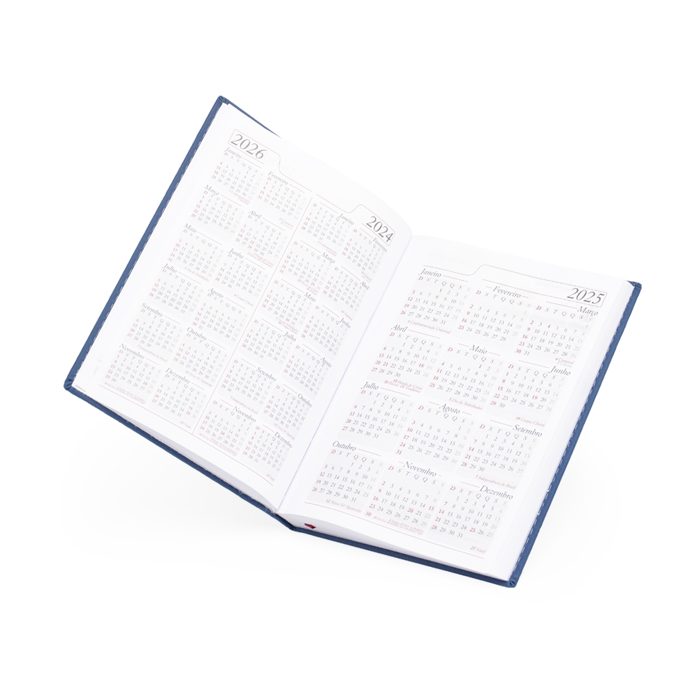 Agenda diária 2025 emborrachada. Contém fita de cetim marca página, dados pessoais, calendários de 2024 à 2026, mapa do Brasil, mapa-múndi, índice telefônico e planejamento.