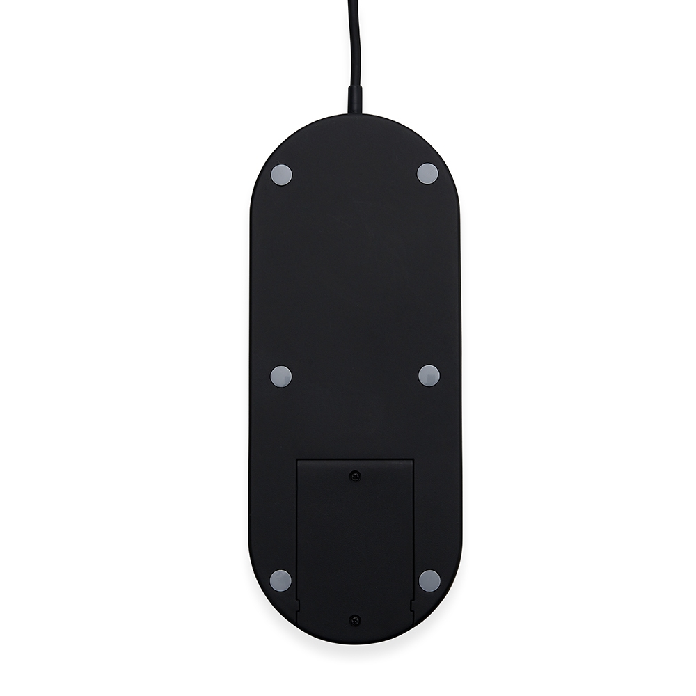 Base de carregamento por indução para celular e Iwatch. Com área de indução inclinável para o Iwatch, a base contém borrachas antideslizantes e cabo USB acoplado.