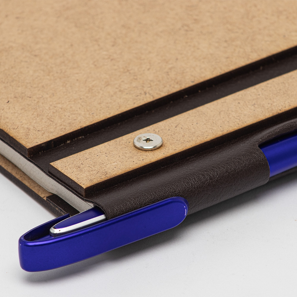 Bloco de anotações Ecológico em MDF com porta caneta e detalhes em couro sintético. Contém aproximadamente 98 folhas recicláveis e sem pauta. OBS.: NÃO ACOMPANHA CANETA, IMAGEM MERAMENTE ILUSTRATIVA.