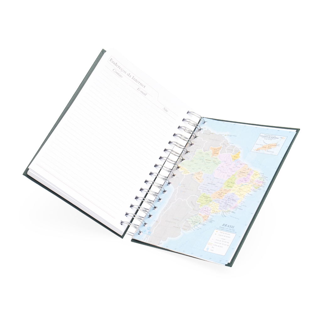 Agenda Wire-o 2026 produzida em material sintético. Contém bolso plástico, dados pessoais, calendário de 2026 à 2026, mapa do Brasil, mapa global, índice telefônico e planejamento.