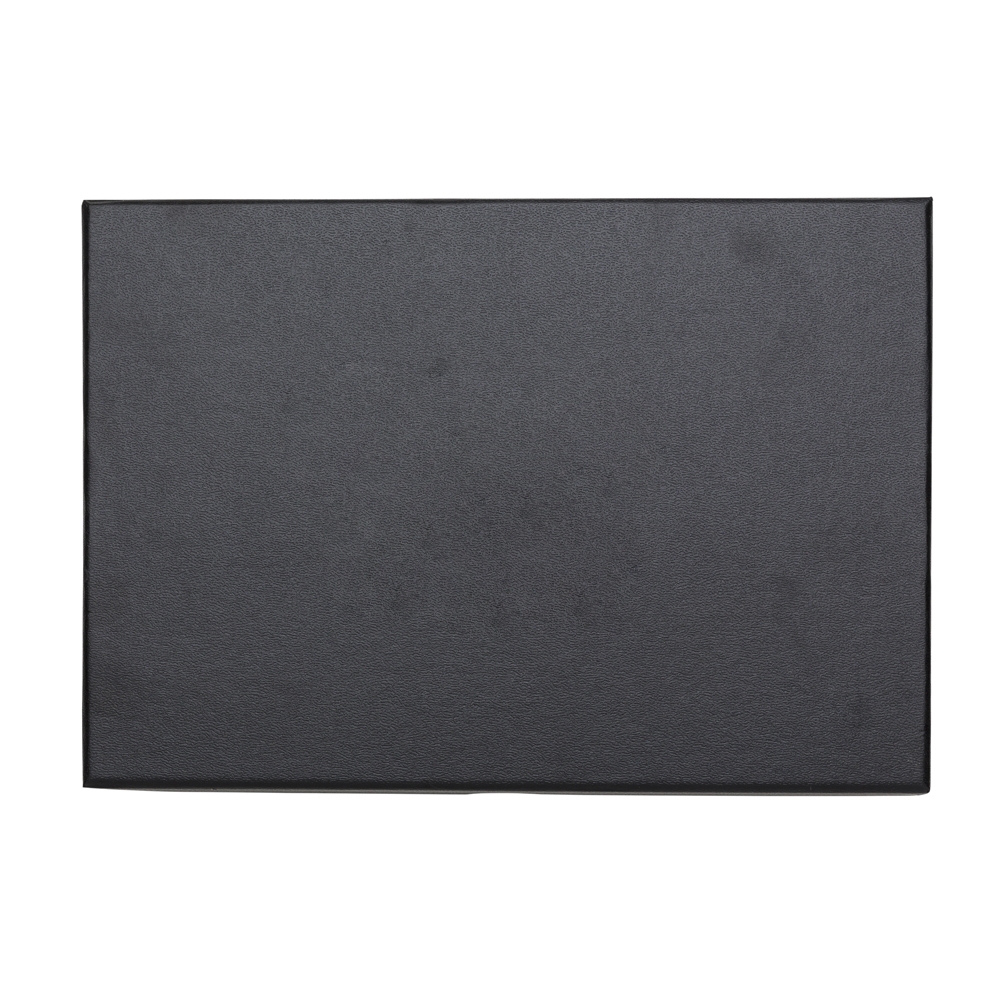Kit executivo 3 peças em estojo de papelão com tampa e parte interna revestida de espuma. Contém: porta cartão de couro sintético texturizado com detalhes prata brilhante, caneta metal fosca com detalhe emborrachado preto, caderneta em couro sintético com aproximadamente 80 folhas amarelas pautadas. Acompanha placa metálica para gravação.