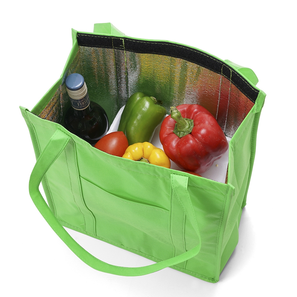 Sacola térmica com capacidade de 18 litros, contém fechamento em velcro e bolso frontal. Obs.: A capacidade de armazenamento com a sacola fechada é de aproximadamente 14 litros.