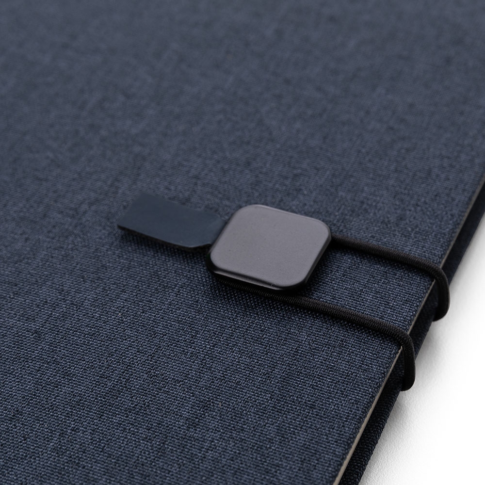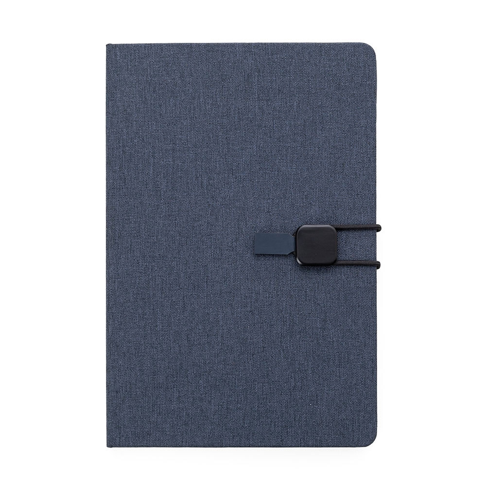 Caderneta capa dura em tecido de poliéster. Miolo com 80 folhas pautadas na cor bege. Possui elástico lateral com detalhe em couro sintético para fechamento do caderno.