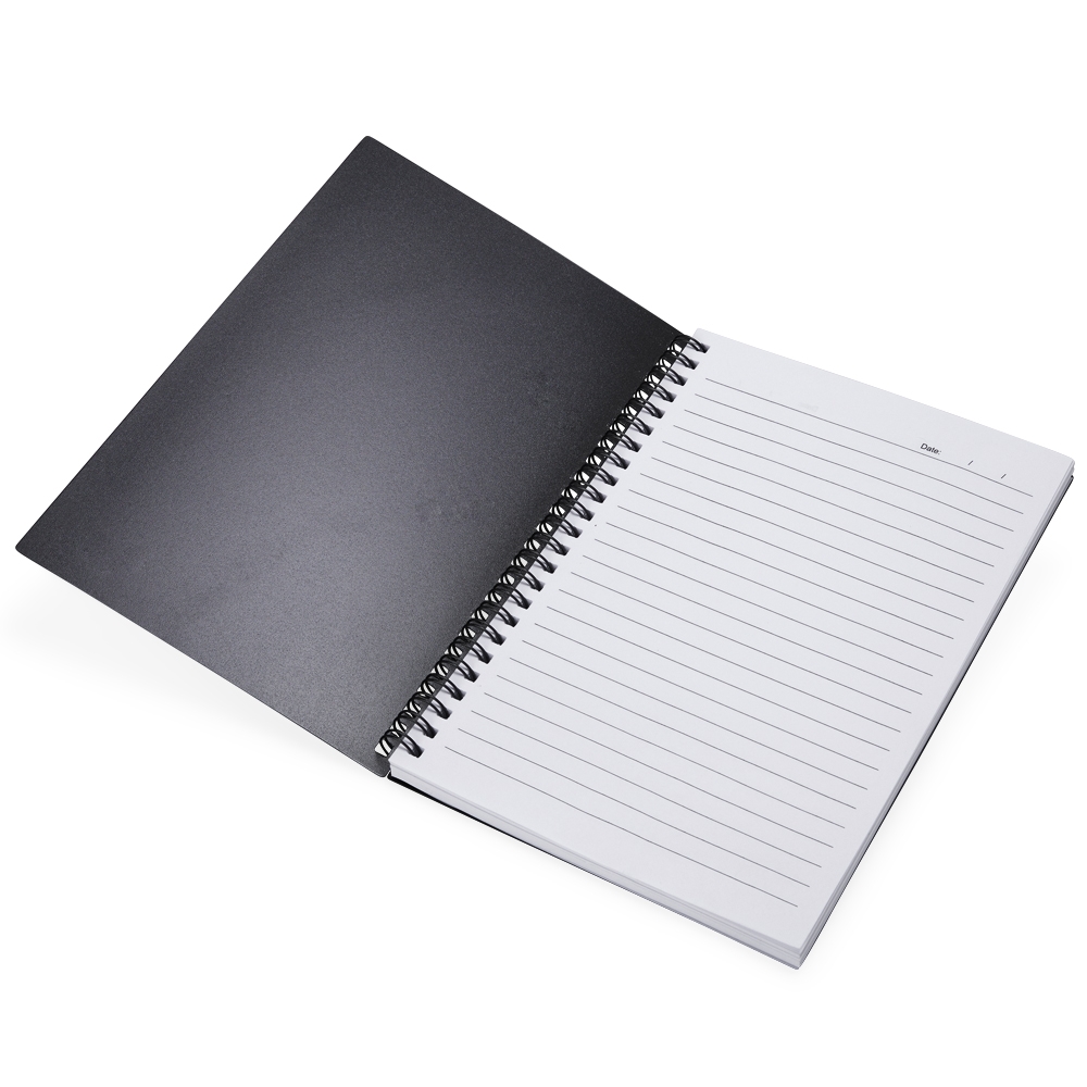 Caderno A5 plástico com wire-o metálico. Capa em PP, contém aproximadamente 80 folhas brancas com pauta.