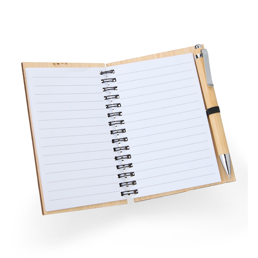 Caderno ecológica com caneta. Capa de bambu. Possui aproximadamente 50 folhas brancas pautadas. Acompanha uma caneta de bambu com detalhes em metal.