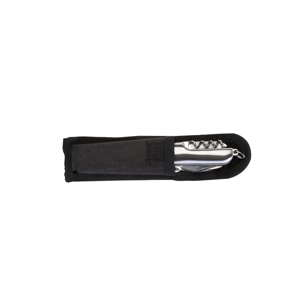 Canivete metal 9 funções com detalhes emborrachados preto(três linhas frente e verso). Possui: lâmina de corte, serrilha, mini tesoura, abridor de latas, abridor de garrafa, chave phillips, lixa, agulha de sutura e saca-rolhas. Acompanha bainha em nylon.