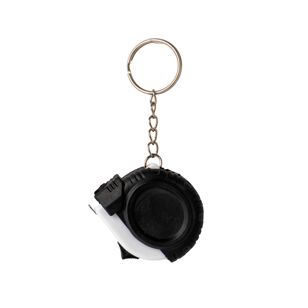 Chaveiro trena de 1 metro plástico com trava, possui aspecto emborrachado e relevo em um dos lados.