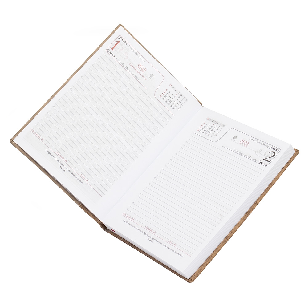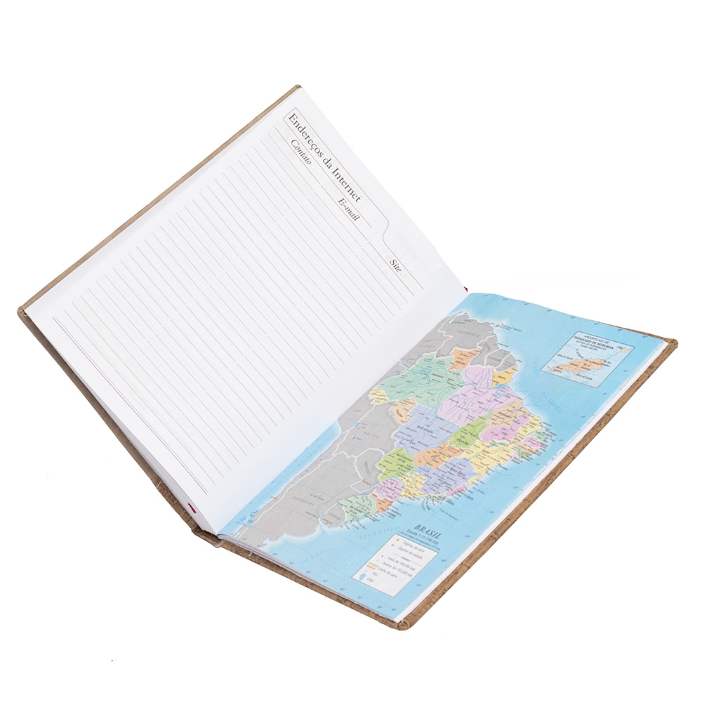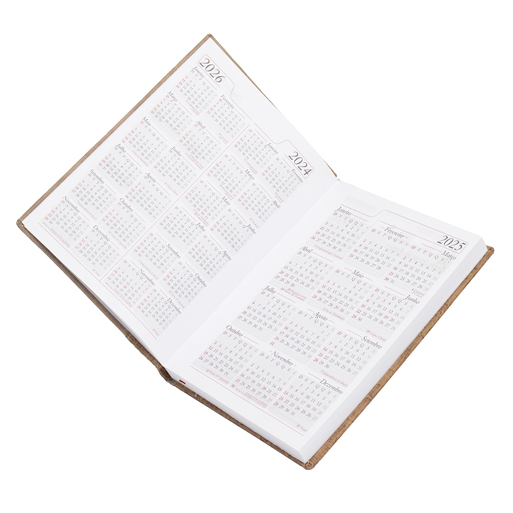 Agenda 2026 de couro sintético. Contém páginas de dados pessoais, calendário 2026, marcador de página, mapa do Brasil, mapa mundi, índice telefônico e planejamento.