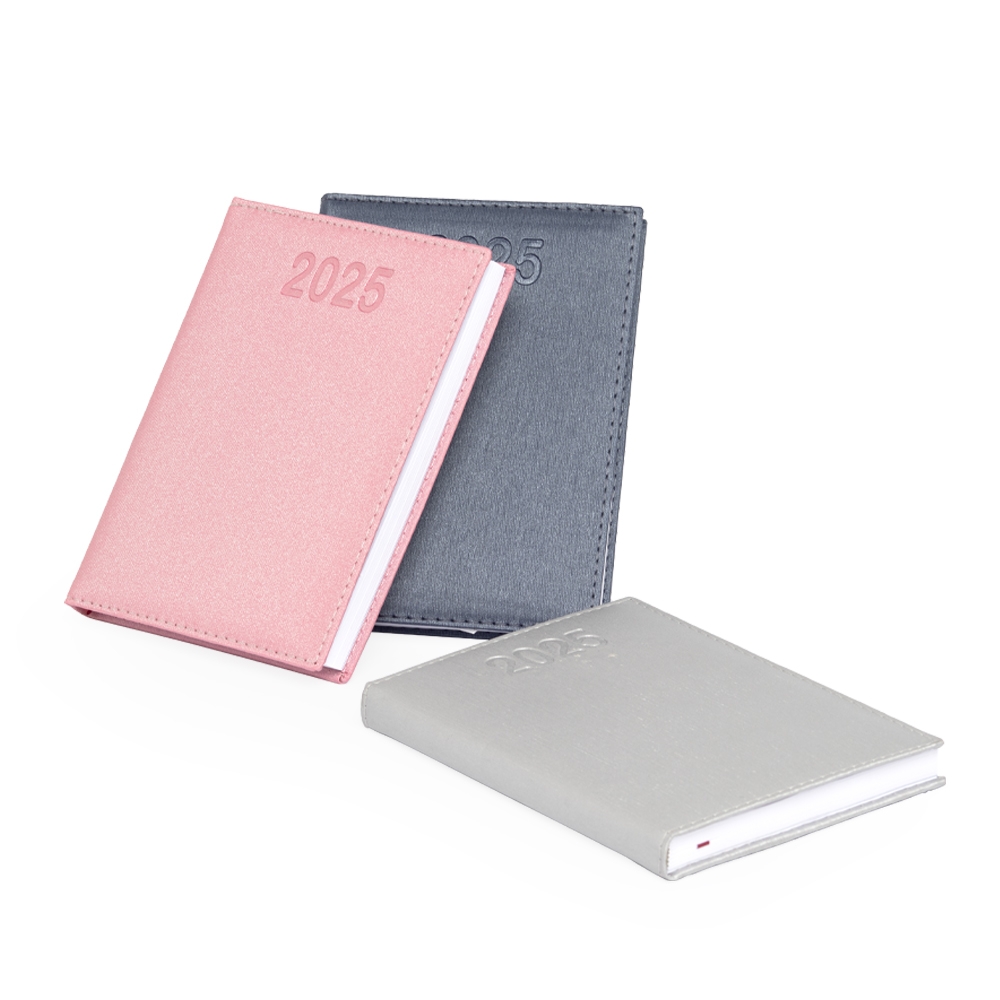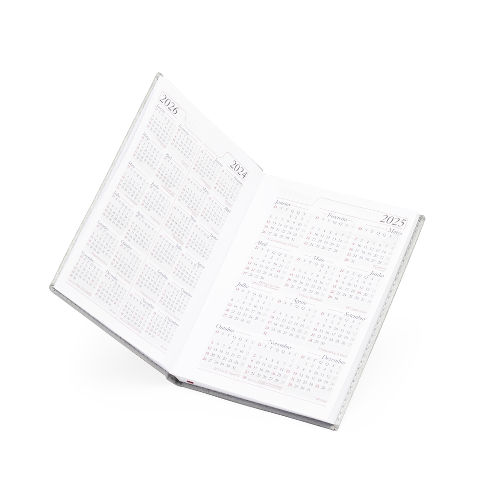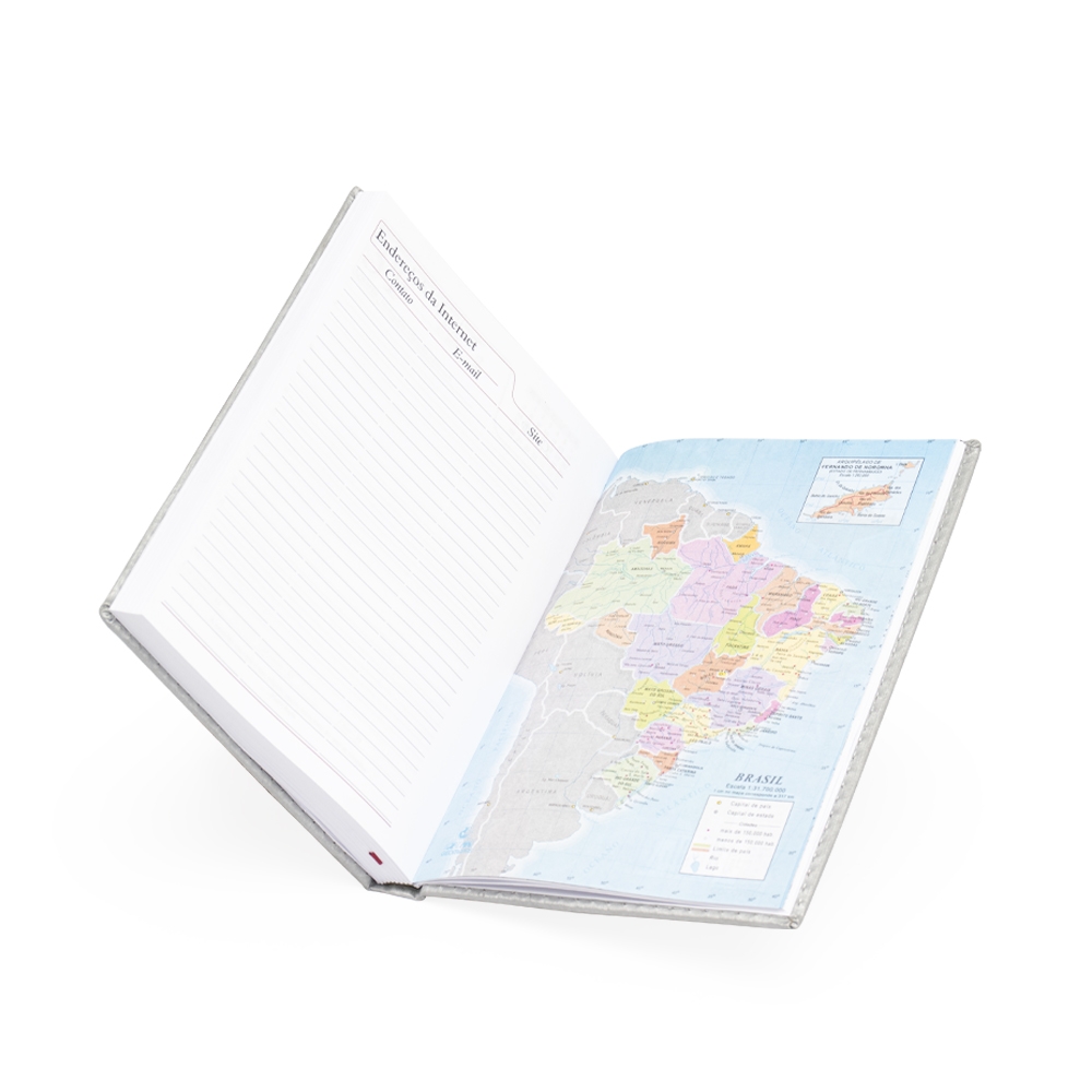 Agenda diária 2026 de couro sintético. Contém fita de cetim marca página, dados pessoais, calendário de 2026, mapa do Brasil, mapa-múndi, índice telefônico e planejamento.