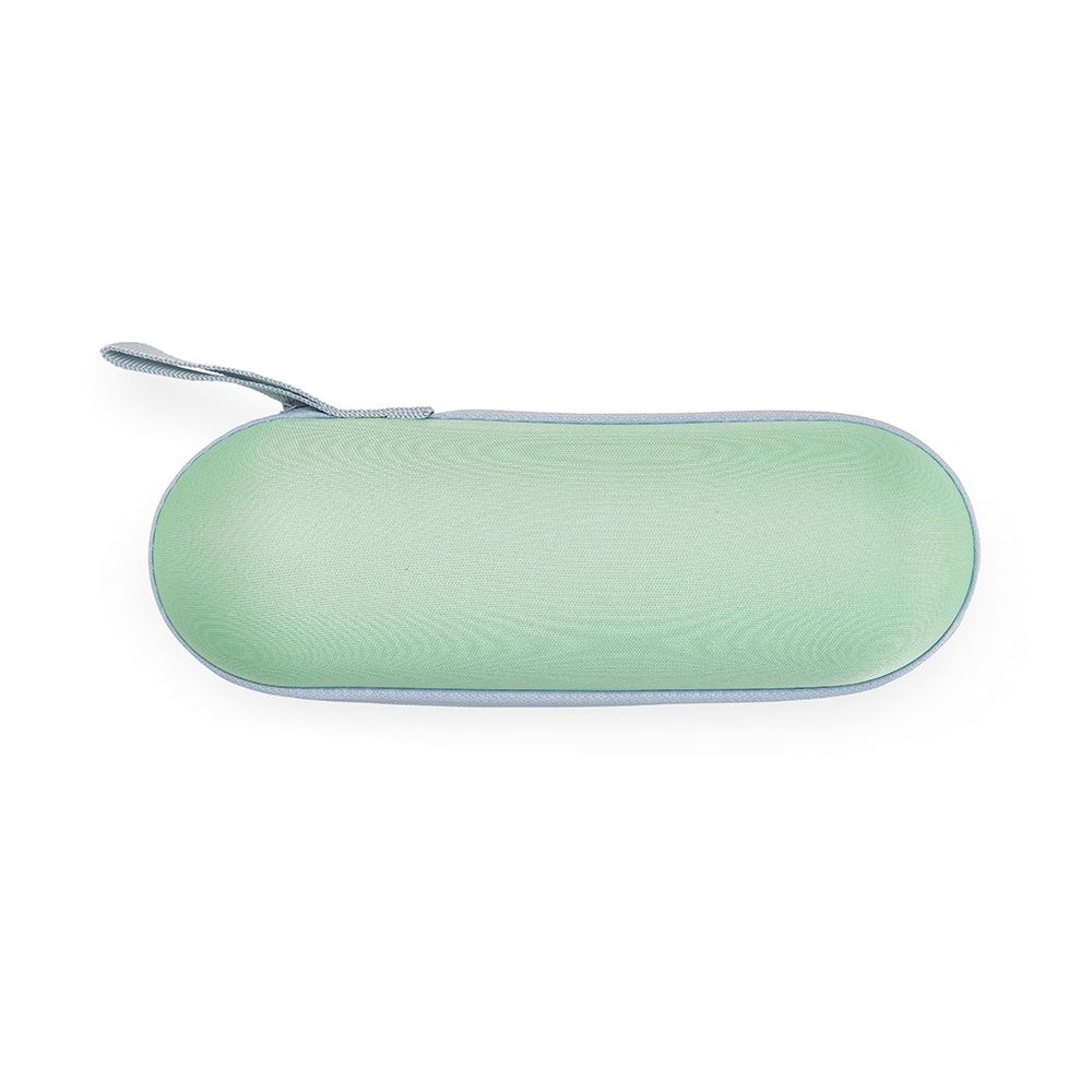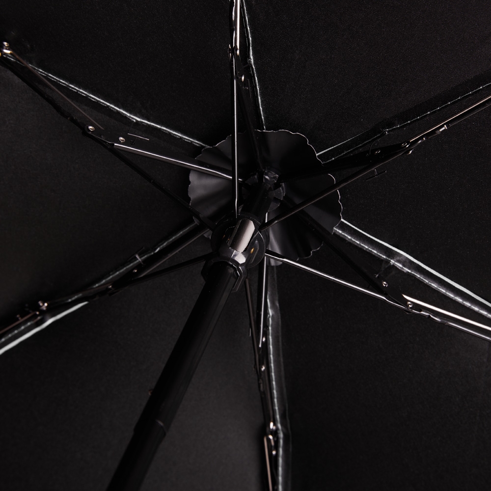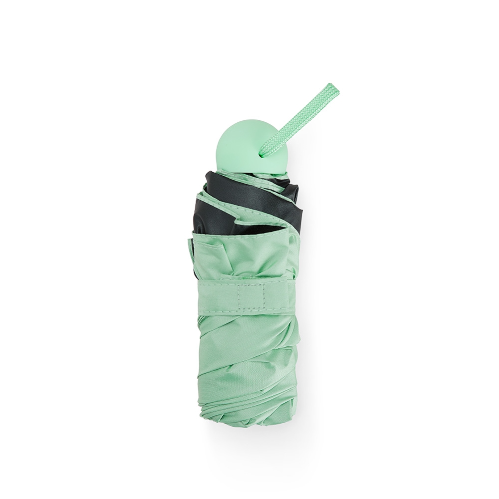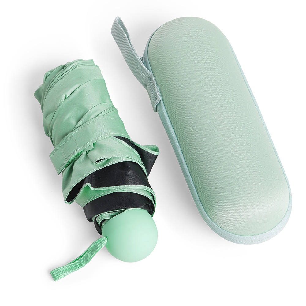 Guarda-chuva manual cápsula em poliéster de impacto impermeável e tecido interno em vinil. Com 6 varetas e estrutura em aço, possui pegador, botão de abertura e alça de Nylon. Acompanha estojo protetor com alça.