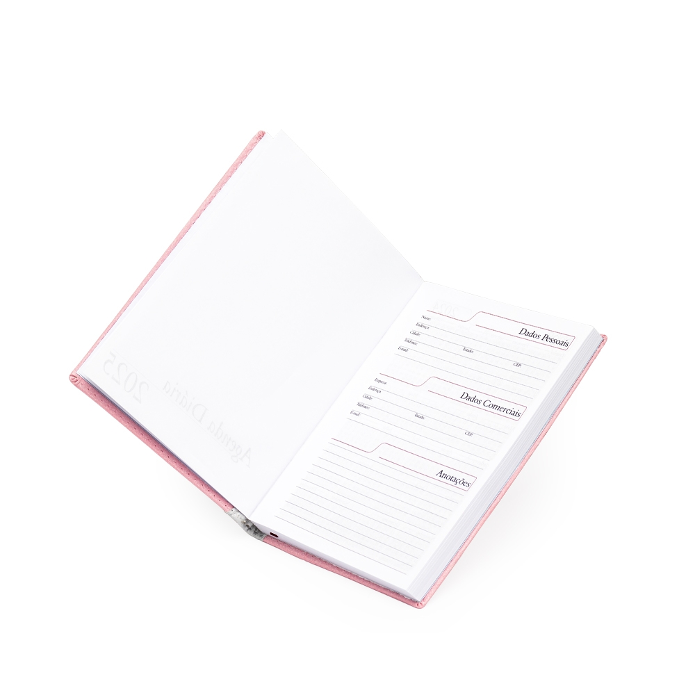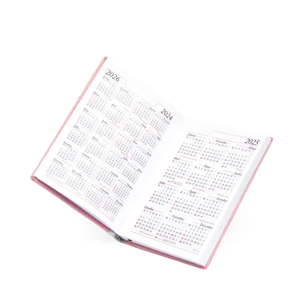 Agenda diária 2026 de couro sintético. Contém fita de cetim marca página, dados pessoais, calendário de 2026 , mapa do Brasil, mapa-múndi, índice telefônico e planejamento.