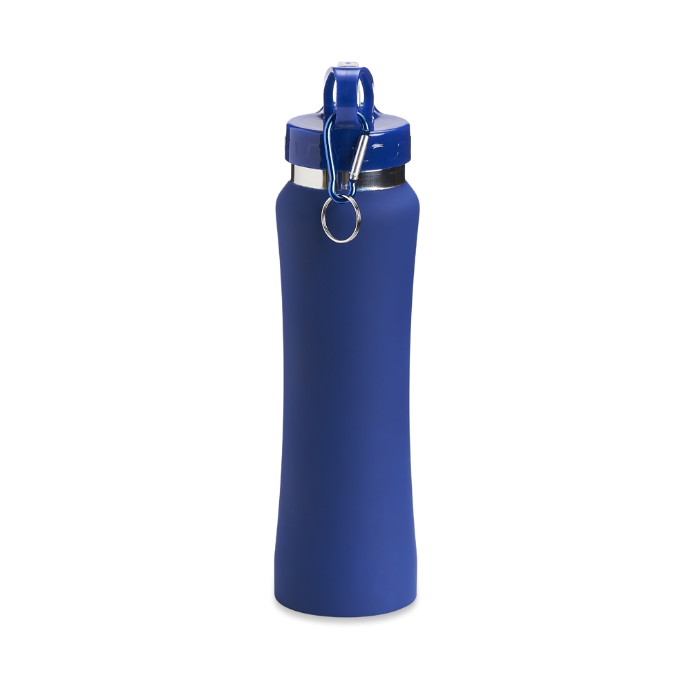 Squeeze de inox com capacidade de 750ml, tampa plástica com bico de canudo. Acompanha mosquetão.
