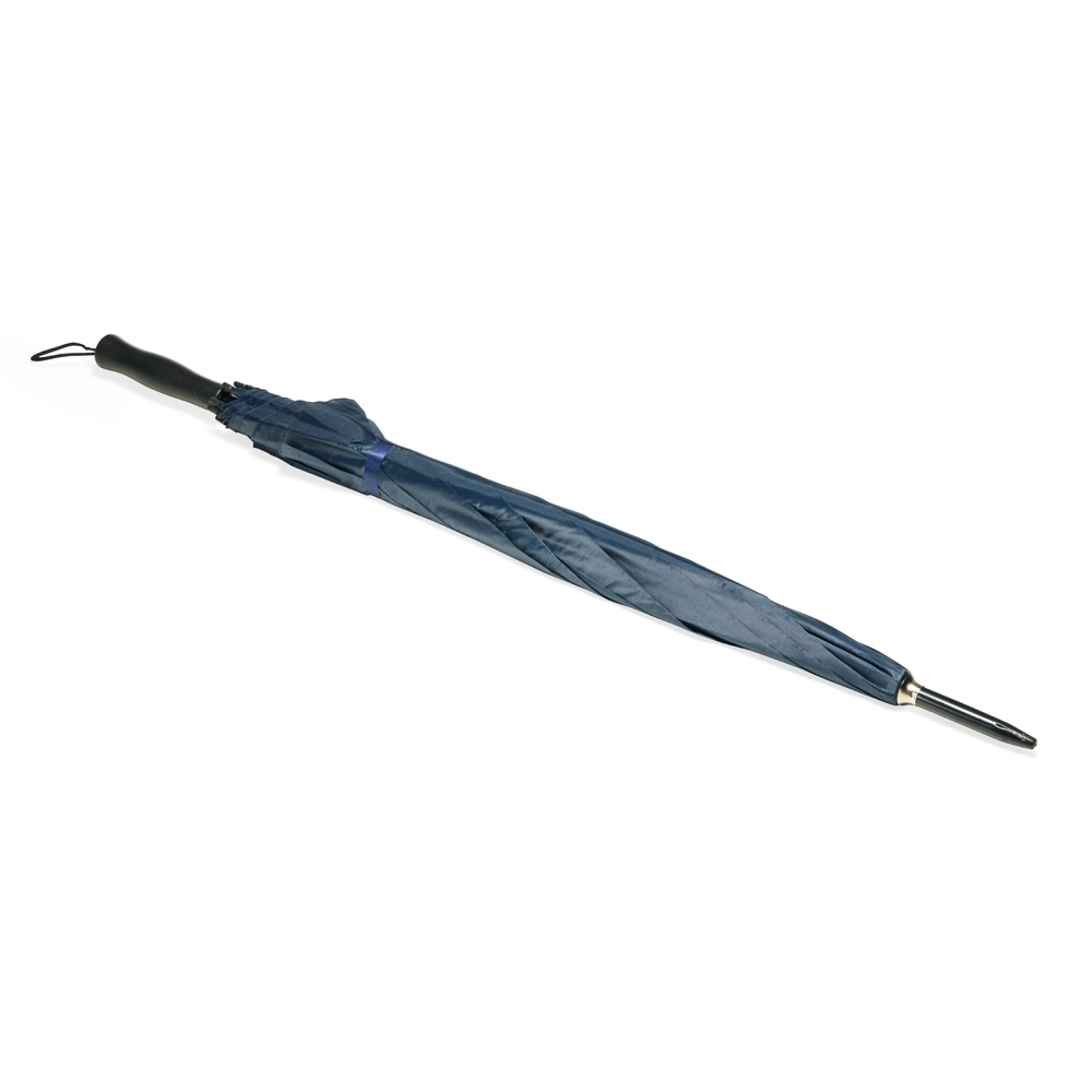 Guarda-chuva em poliéster com abertura automática, estrutura metálica com oito varetas e pegador em plástico com alça de nylon fixa na extremidade.