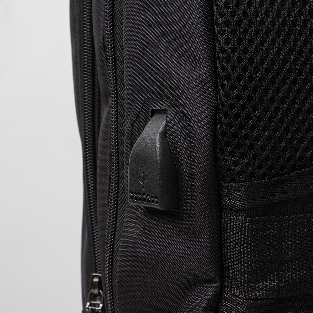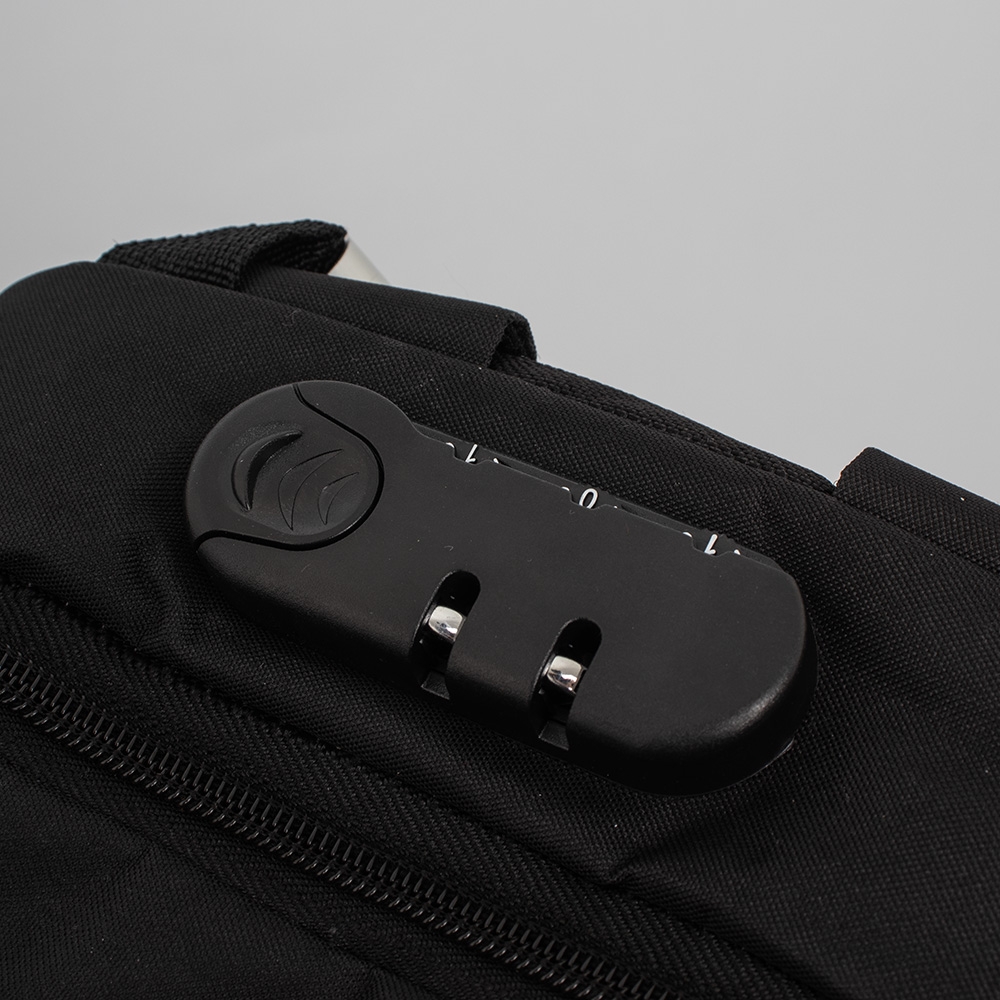 Mochila anti-furto com cadeado de segredo. Produzido em poliéster, tem a parte frontal à prova d?água (respingos). Compartimento principal com bolso para notebook 15,6 e divisórias, bolso de tela, parte externa com cadeado de segredo para trava dos zíperes e bolso frontal. Possui entrada para fone de ouvido, suporte com entrada USB na parte externa e cabo USB acoplado internamente permitindo a conexão de um carregador portátil na área interna e a conexão de um eletrônico na área externa, viabilizando a carga e utilização do eletrônico enquanto caminha. Alças para as costas ajustáveis revestidas com espuma, alça para mãos em alumínio e alça para encaixe em malas de viagem. Utilização do cadeado: para criar um segredo, pressione e segure o botão, crie a numeração desejada e em seguida solte o botão para assumir a codificação criada. Repita o mesmo processo sempre que necessitar fazer alguma alteração.