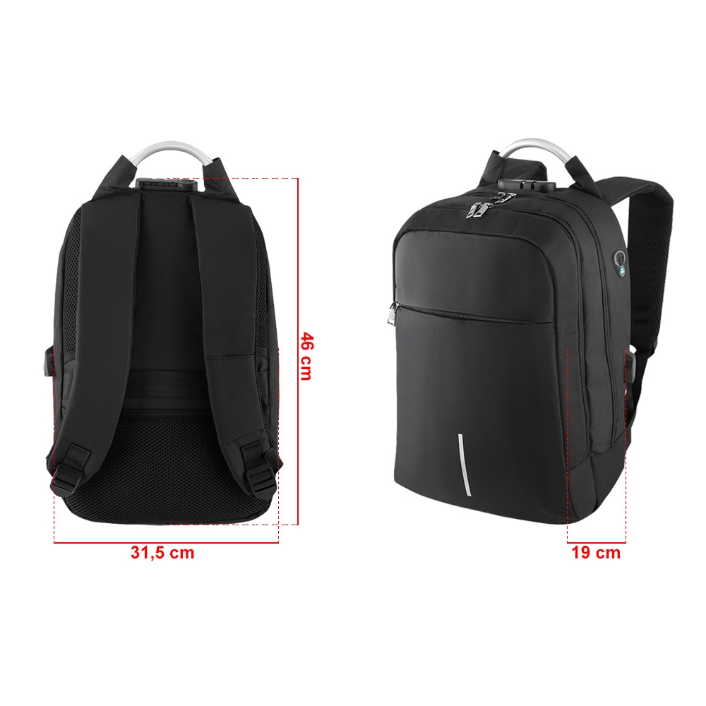 Mochila anti-furto com cadeado de segredo. Material de poliéster cinza, tem a parte frontal à prova d?água (respingos). Compartimento principal com bolso para notebook e bolso de tela, parte externa com cadeado de segredo para trava dos zíperes bolso médio com pequenas divisórias e bolso frontal com fita reflexiva. Possui entrada para fone de ouvido, suporte com entrada USB na parte externa e cabo USB acoplado internamente permitindo a conexão de um carregador portátil na área interna e a conexão de um eletrônico na área externa, viabilizando a carga e utilização do eletrônico enquanto caminha. Alças para as costas ajustáveis revestidas com espuma para um maior conforto, alça para mãos em metal e alça horizontal para encaixe em malas de viagem. Utilização do cadeado: para criar um segredo pressione e segure o botão, crie a numeração desejada e em seguida solte o botão para assumir a codificação criada, repita o mesmo processo sempre que necessitar fazer alguma alteração.