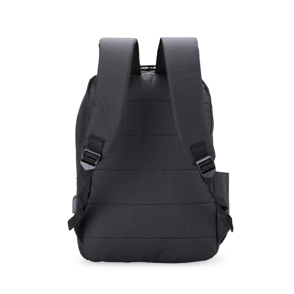 Mochila de nylon 24 litros com três compartimentos, sendo o principal com bolso para notebook 14 polegadas. A mochila possui um bolso lateral e suporte externo usb.
