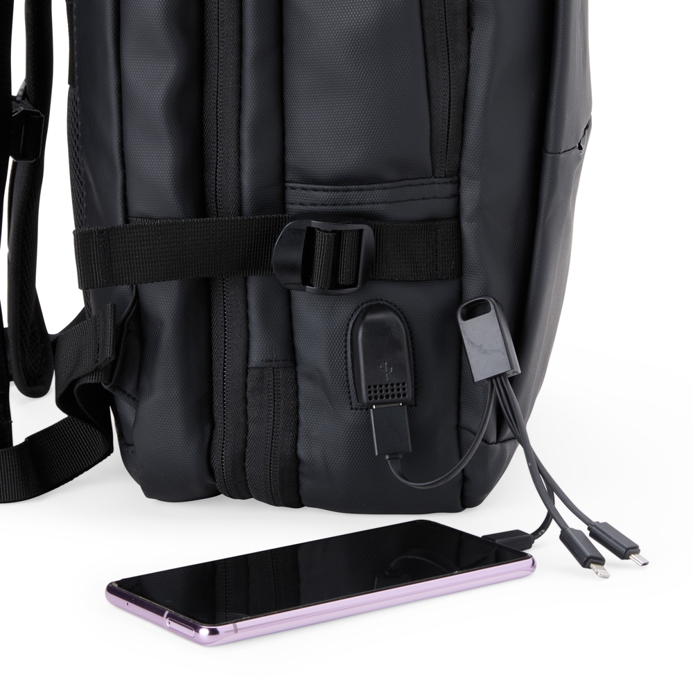 Versátil e amplo espaço, nossa mochila de 36 litros atende às necessidades do escritório a viagens profissionais, unindo funcionalidade e visual executivo. Com design expansivo, permitindo aumentar sua capacidade de carga quando necessário, é resistente à água e combina a sofisticação do couro sintético com a versatilidade para o dia a dia. Possui três compartimentos, sendo um deles para notebook de até 15,6? e espaço para tablet. Outro compartimento que se destaca é o expansivo, com fivelas ajustáveis. Este espaço possui abertura lateral e inclui uma cinta compressora para deixar as peças presas e seguras. Além disso, a mochila possui uma alça na lateral, transformando-a em uma mala quando desejar, compartimentos como bolsos interno, divisórias para acessórios, entrada para USB, alças ajustáveis e de compensação para distribuir o peso de forma mais equilibrada, engate para mala de viagem garantindo mais praticidade ao caminhar, dois bolsos na parte frontal com fechamento por zíper e para deixá-la mais completa acompanha uma plaquinha de metal, permitindo a personalização exclusiva. Essa mochila é perfeita para o seu cliente levar tudo o que precisa e mais um pouco!