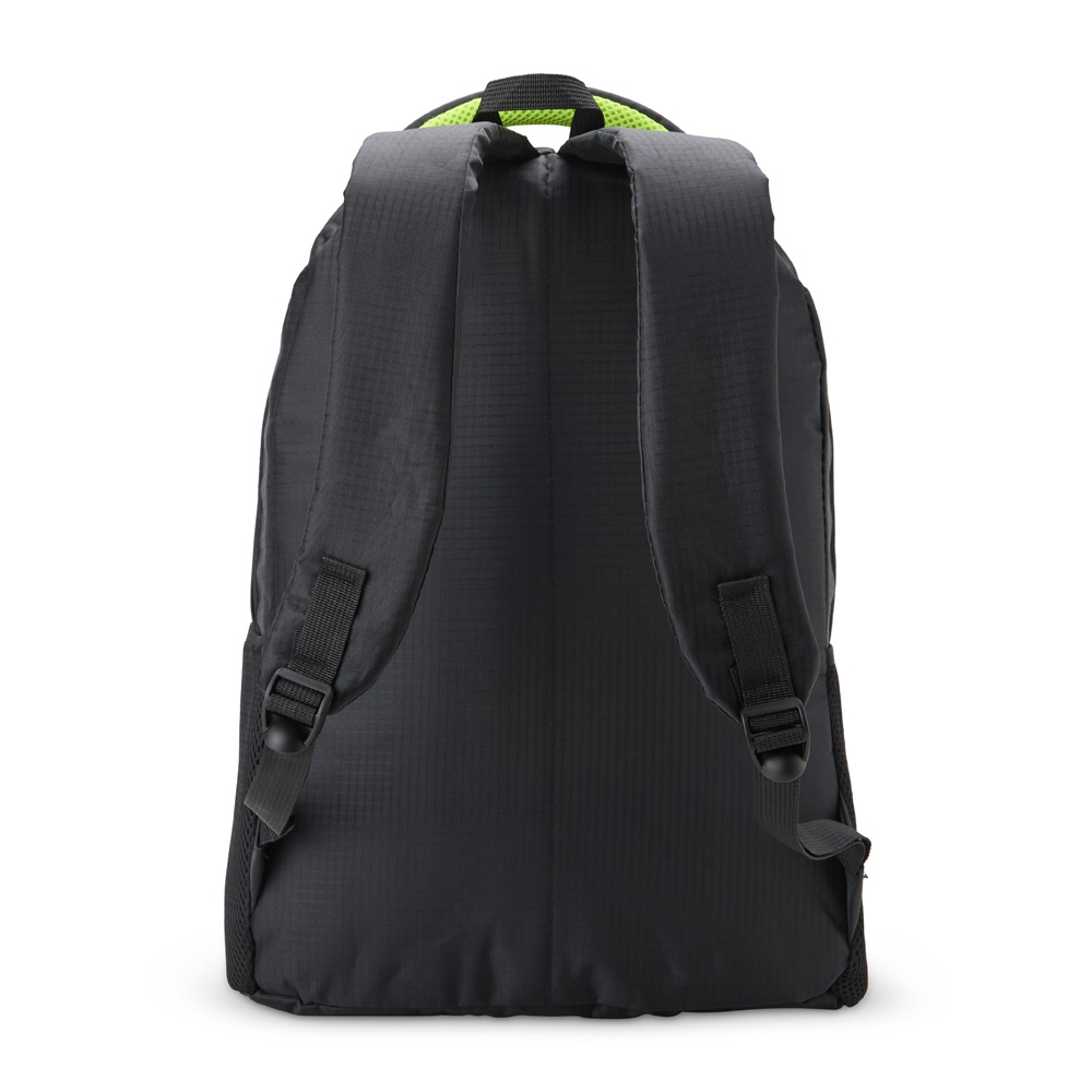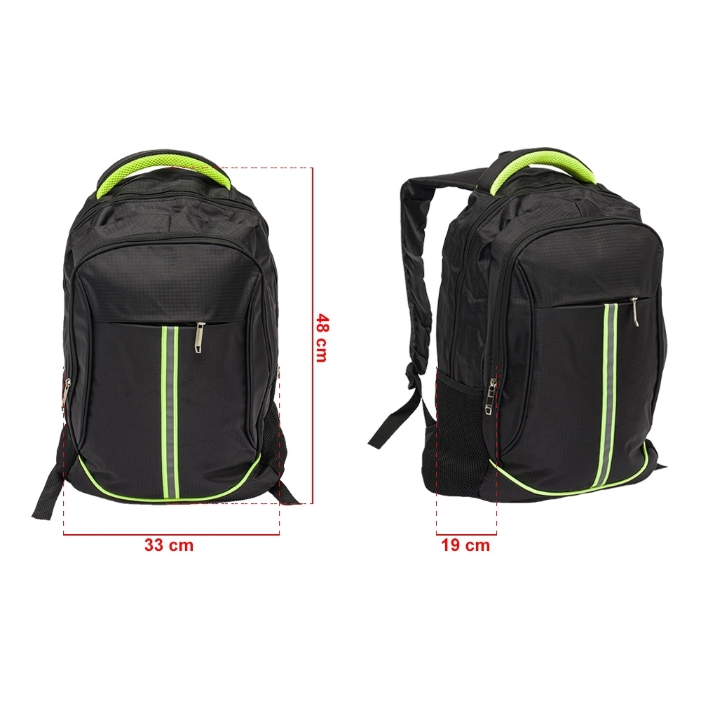 Mochila de nylon 30 Litros com três compartimentos, sendo o principal com bolso para notebook de 15,6. A mochila possui bolsos laterais em malha e faixa reflexiva na parte frontal.