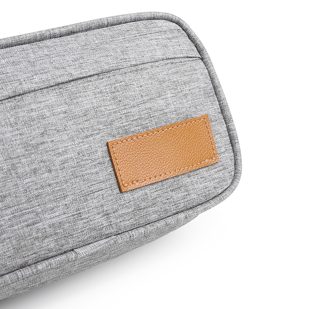 Nécessaire confeccionada em poliéster com detalhes em couro sintético, possui dois compartimentos com zíper, alça para transporte e alça pequena para acesso de chaveiro ou gancho.