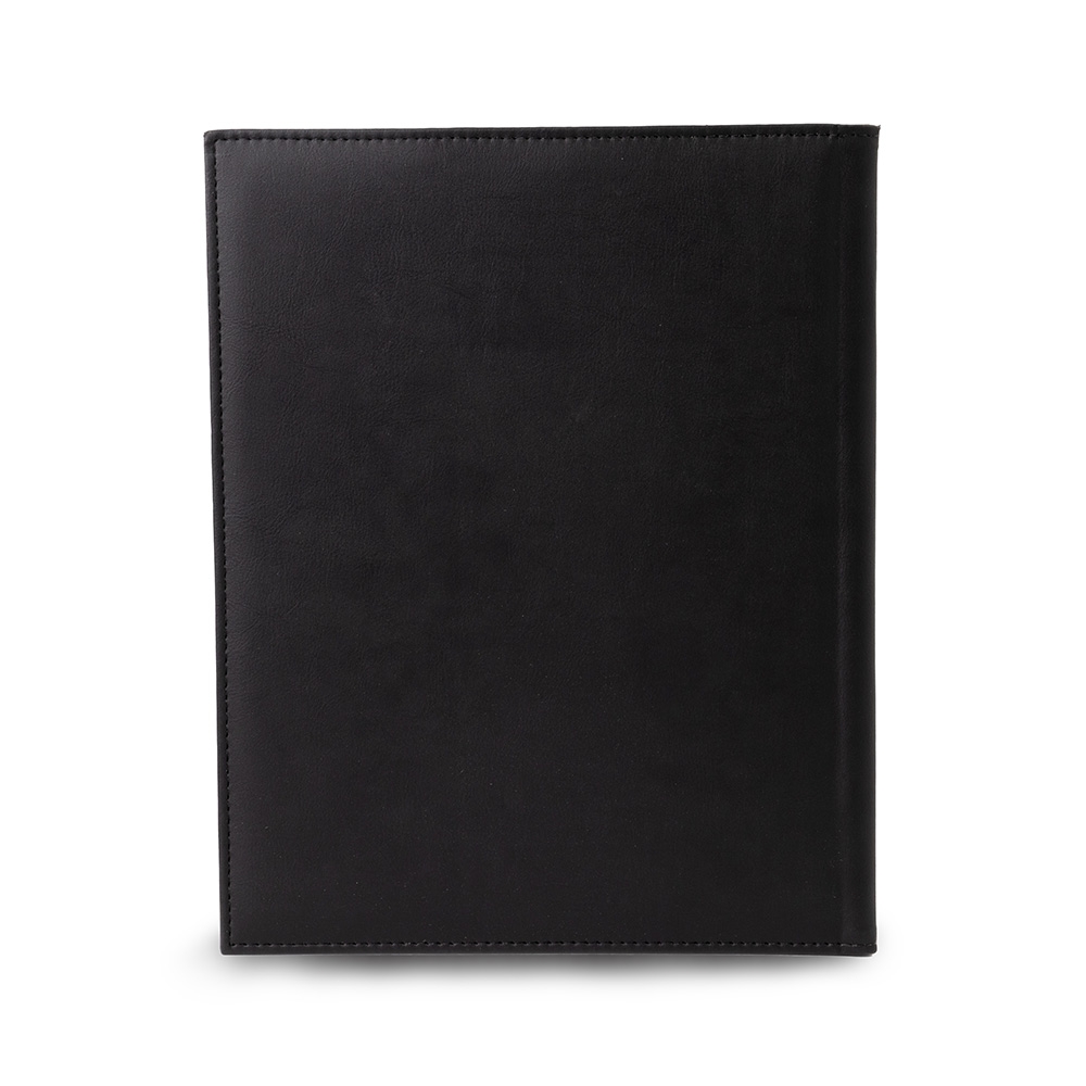 Pasta convenção de couro sintético, possui porta caneta, dois compartimentos, sendo um para arquivar documentos e um bloco com aproximadamente 15 folhas brancas não pautadas.