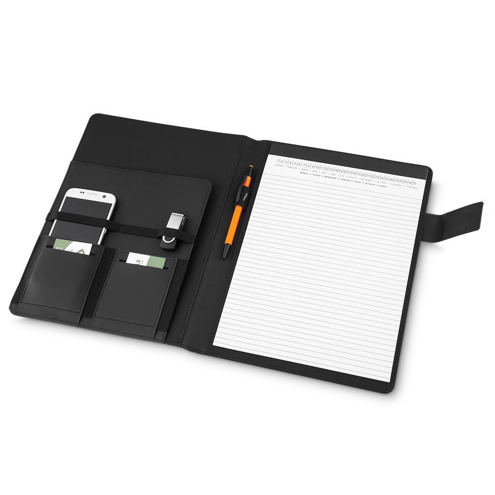 Pasta convenção de tecido sintético, possui fecho magnetizado com plaquinha para personalização em preto fosco. Parte interna com compartimento grande para arquivar documentos,três divisórias elásticas, duas divisórias para celular e cartões, suporte elástico para caneta e bloco com aproximadamente 20 folhas brancas pautadas com dias do mês na área superior.