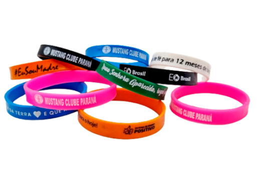 Pulseiras emborrachadas personalizadas em diversos cores e tamanhos. Ideais para eventos corporativos, festas, campanhas promocionais e branding. Material de silicone atóxico e resistente.
