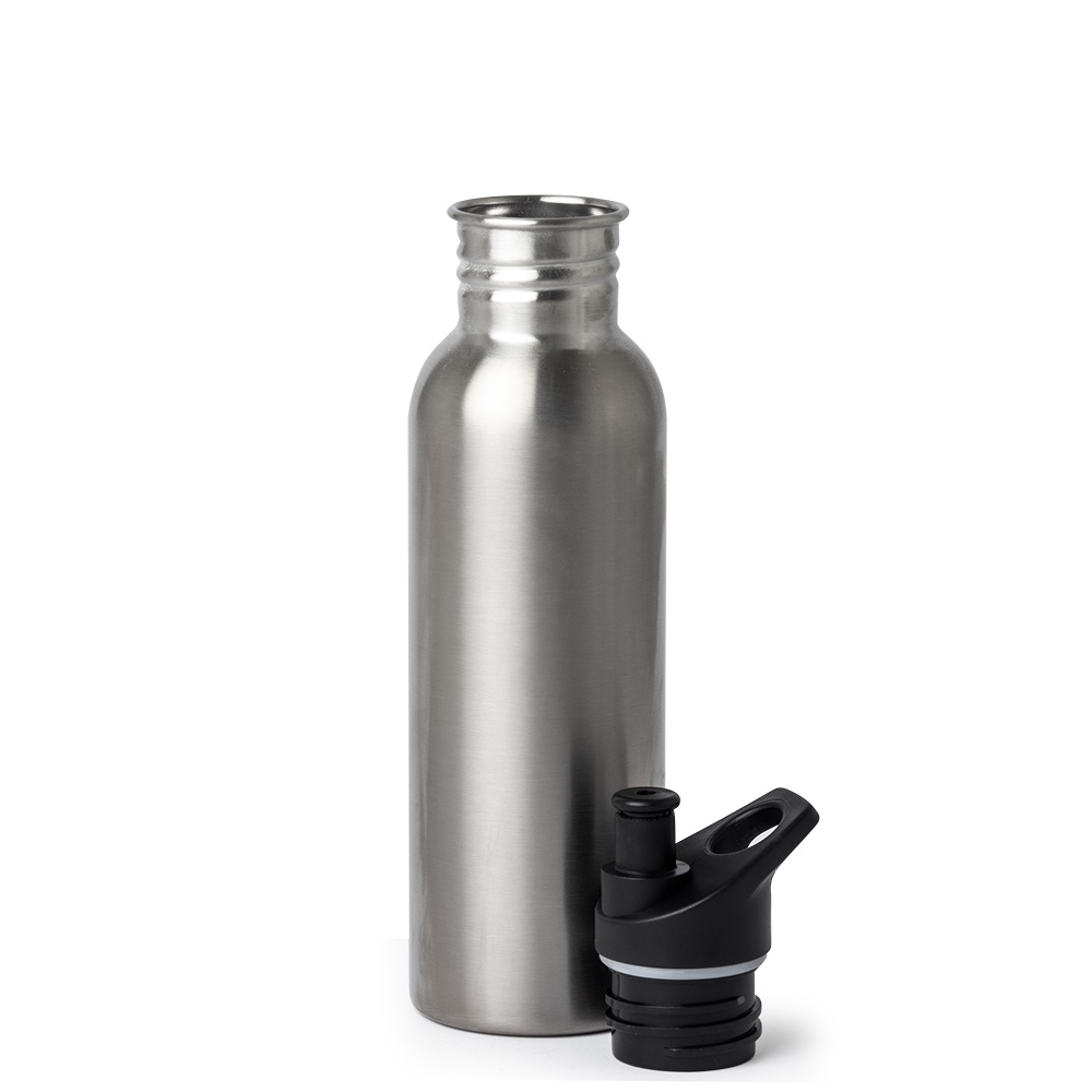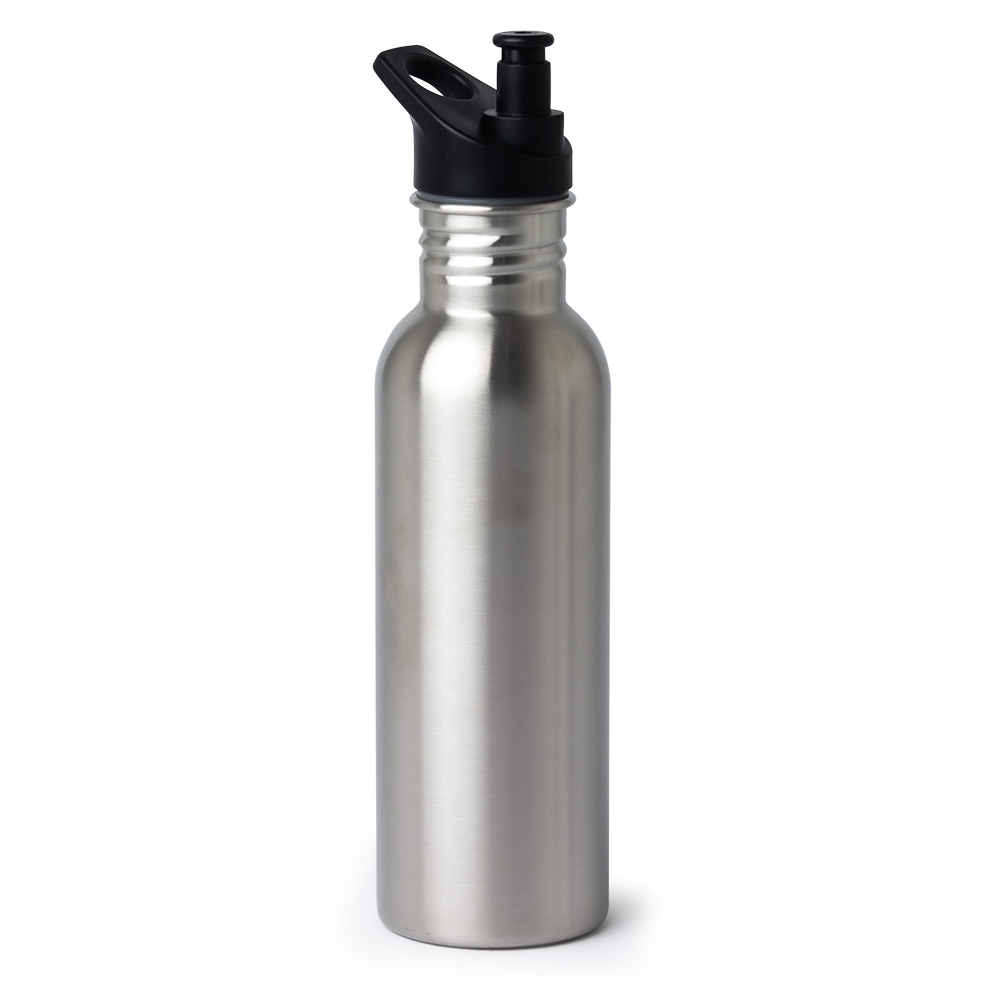 Squeeze inox com capacidade 700ml. Possui tampa rosqueável com bico plástico e alça integrada.