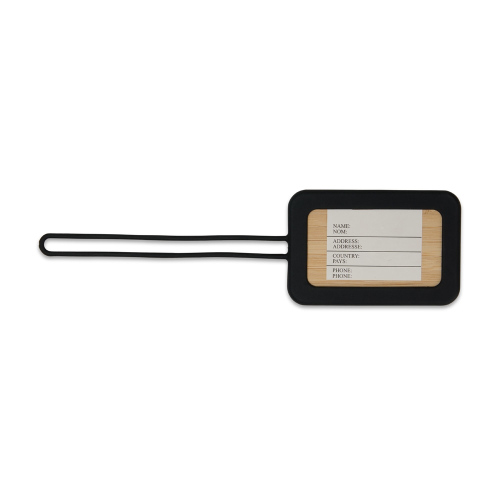 Tag identificador de bagagem de Bambu e silicone. Parte frontal com área de identificação e verso liso para personalizações.